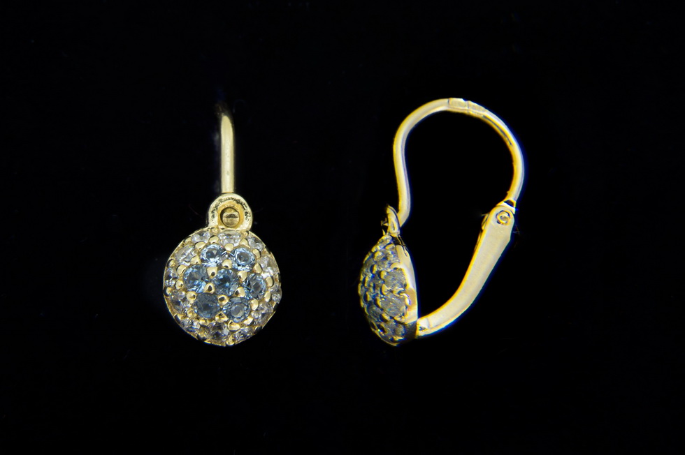 Dětské náušnice "pecičky" ze žlutého zlata Au585/1000 zdobené čirými a modrými zirkony.